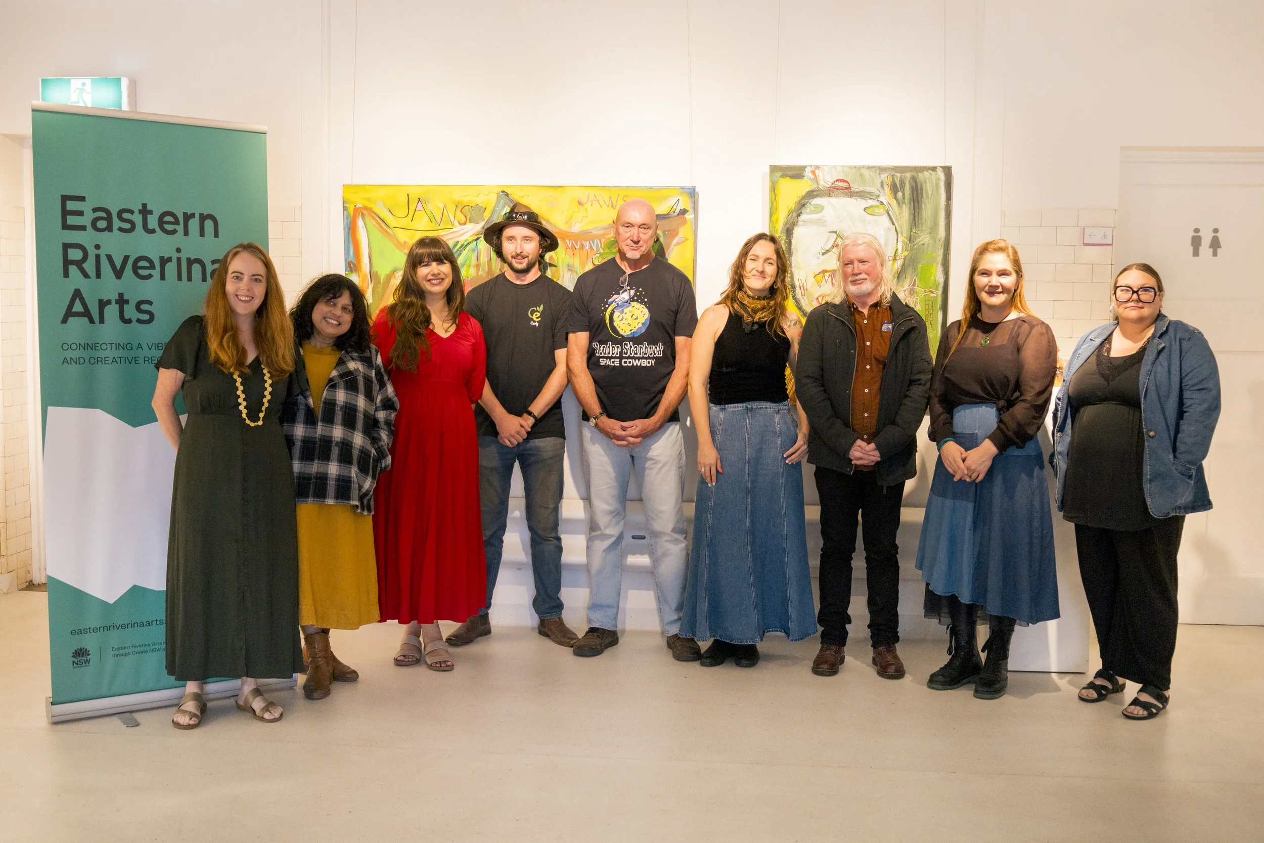 2026 Eastern Riverina Writers Grant recipients. Left to right: Katrina Roe, Sulari Goonetilleke, Gabrielle Tozer, James Mills, Craig Steven Palmer (See Me Hear Me Theatre), Victoria Vigenser, Lindsay Martin, and Rachel Johnston (We Mavericks), and Phillippa Heinecke (Booranga Writers Centre).